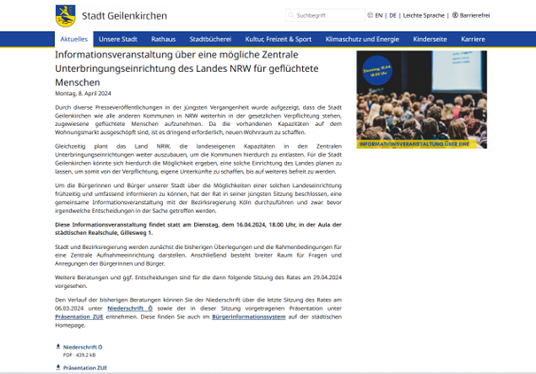 Am 16.04.2024 findet um 18:00 Uhr die Informationsveranstaltung zur Möglichkeit der Errichtung einer Zentralen Unterbringungseinrichtung des Landes NRW für geflüchtete Menschen in Geilenkirchen statt!
