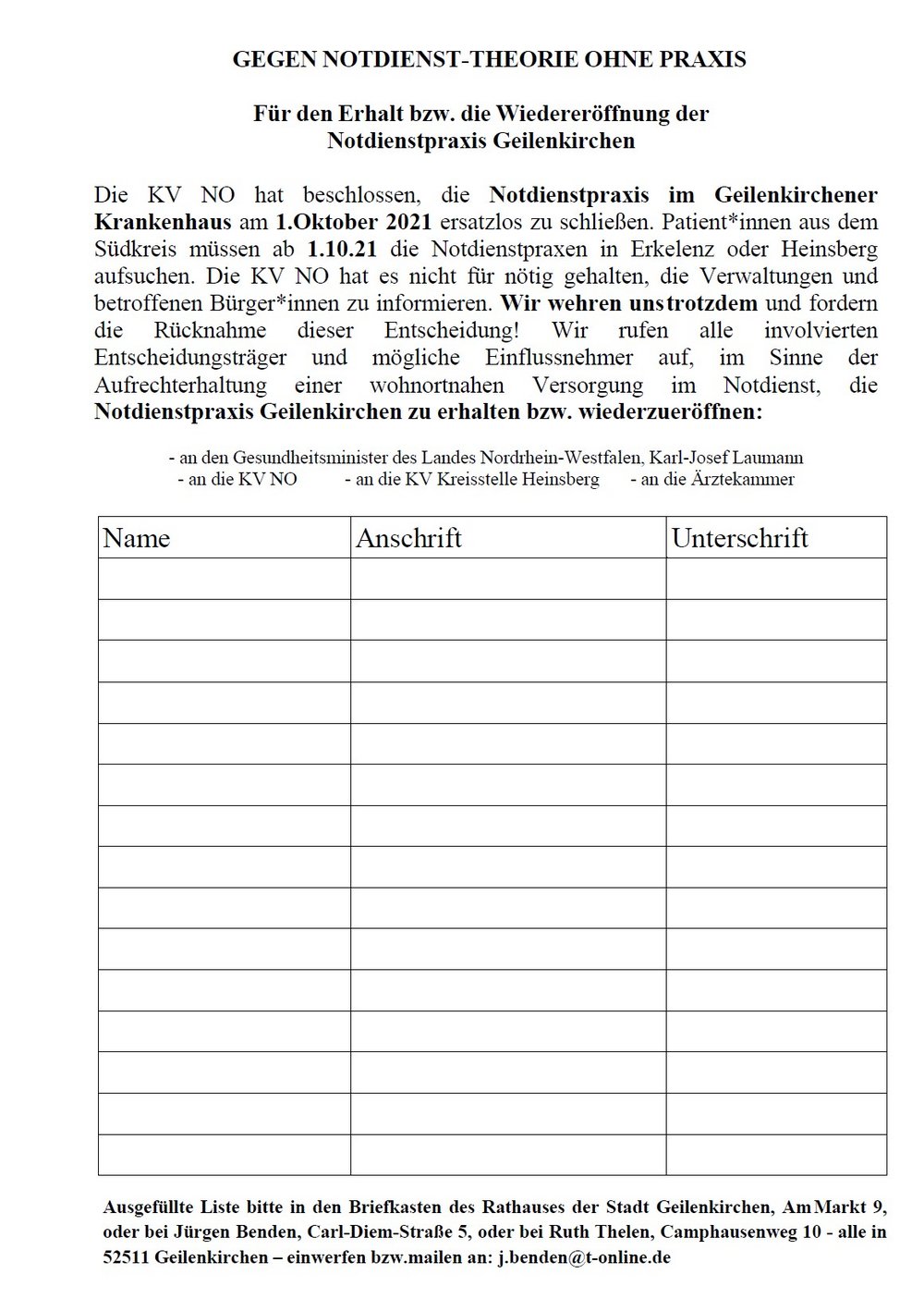 Wir wehren uns trotzdem und fordern die Rücknahme dieser Entscheidung! Wir rufen alle involvierten Entscheidungsträger und mögliche Einflussnehmer auf, im Sinne der Aufrechterhaltung einer wohnortnahen Versorgung im Notdienst, die Notdienstpraxis Geilenkirchen zu erhalten bzw. wiederzueröffnen.