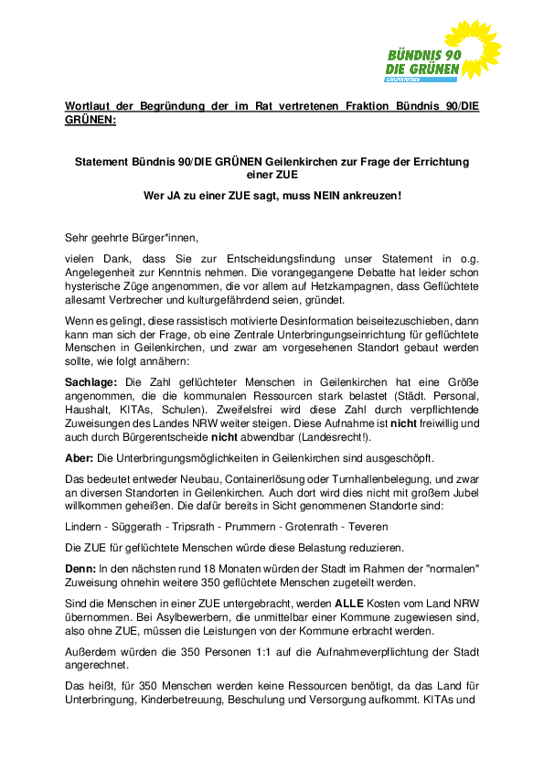 Letztlich: Ohne ZUE belasten wir Haushalt, Personal und Bildungseinrichtungen - und damit unsere Kinder. Weiterhin verzerren wir den Wohnungsmarkt und kommen nicht umhin in diversen Dörfern auf öffentlichem Grund Container zu errichten. Die Gegenfinanzierung von mindestens 18 Millionen Euro in den kommenden zehn Jahren wird über die Geilenkirchener Bürgerschaft geschehen müssen. Fazit, ohne ZUE ist zu befürchten, dass früher oder später die Grundsteuer und auch die Gewerbesteuer erhöht werden muss und freiwillige Leistungen wie z.B. die Vereinsförderungen nicht mehr finanzierbar sind.