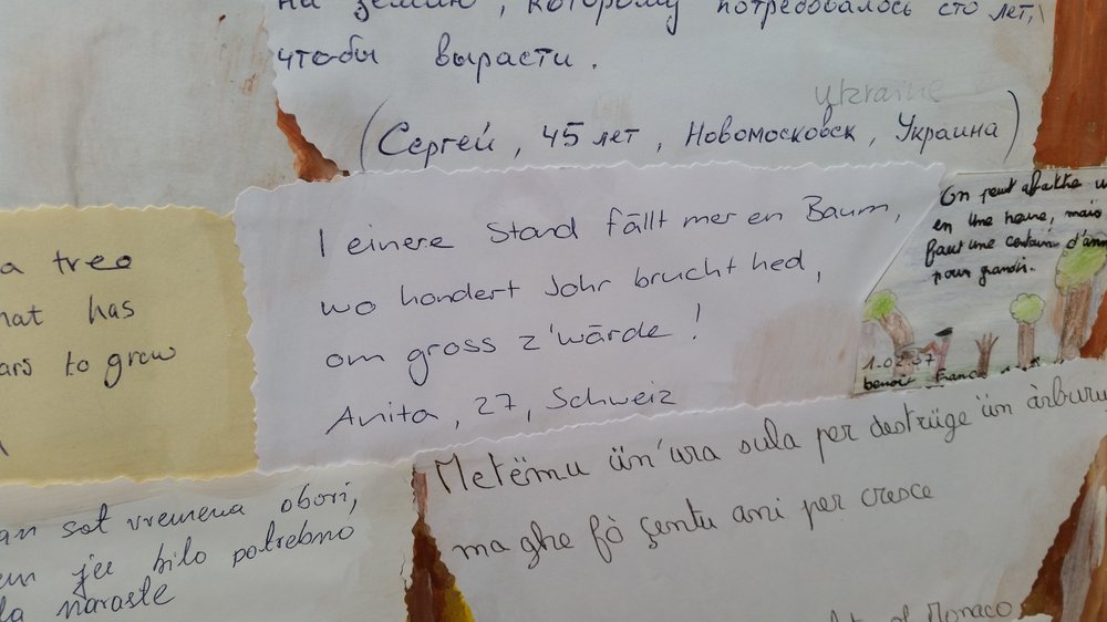 Den durfte die Geilenkirchener Künstlerin Brigitte Breiksch-Elkenhans ebenfalls ernten. Denn vor einigen Jahren kam ihr die Idee, den Satz „In einer Stunde streckt man einen Baum zu Erden, der hundert Jahre hat gebraucht, um groß zu werden“ in möglichst viele Sprachen übersetzen zu lassen.