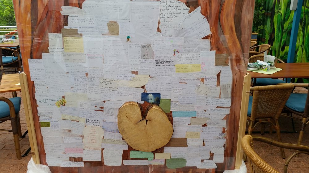 Aus den nun in 100 Sprachen vorliegenden Ergebnissen formte sie mit Hilfe ihres Mannes und Tochter Sarah eine eindrucksvolle Collage, die den grünen Gedanken auf künstlerische Weise formuliert.