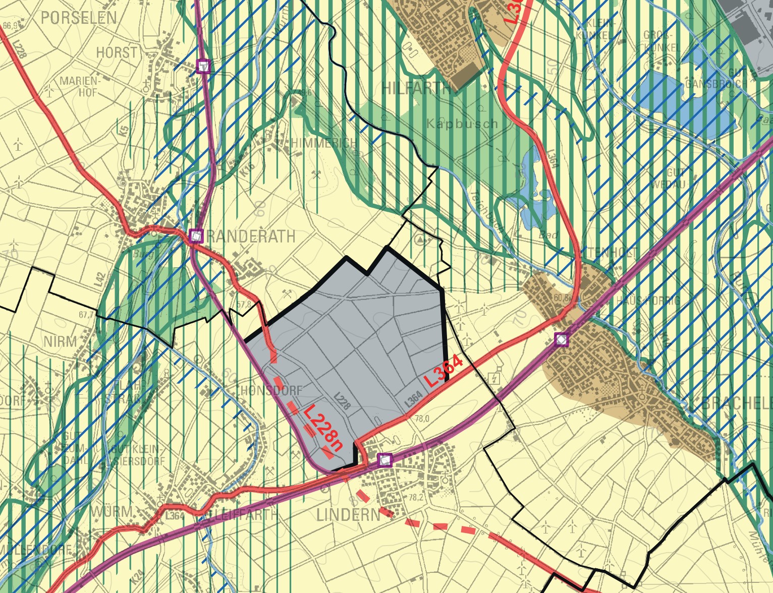 Die L 364n wird als Umgehungsstraße für Hückelhoven verkauft, wird aber vielmehr benötigt um den Schwerlastverkehr an das Industriegebiet Lindern, die Future Site InWest, anzubinden und vernichtet sehr viele hochwertige Flächen.