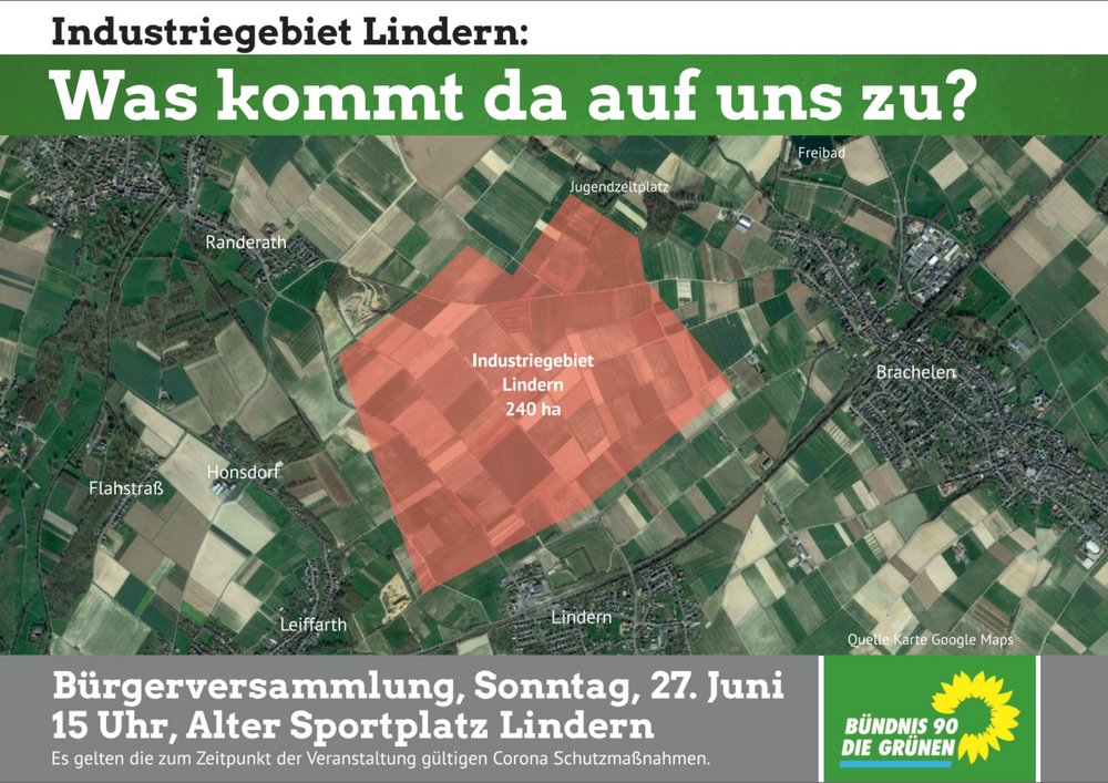 Am 27. Juni informieren wir Euch über die neuen Pläne zum Industriegebiet in Lindern. Was hat die Stadt Geilenkirchen in Lindern vor? Welche Auswirkungen ergeben sich für Euch? Ist eine Entscheidung schon gefallen? Welchen Einfluss hat die WFG und NRW.Urban?