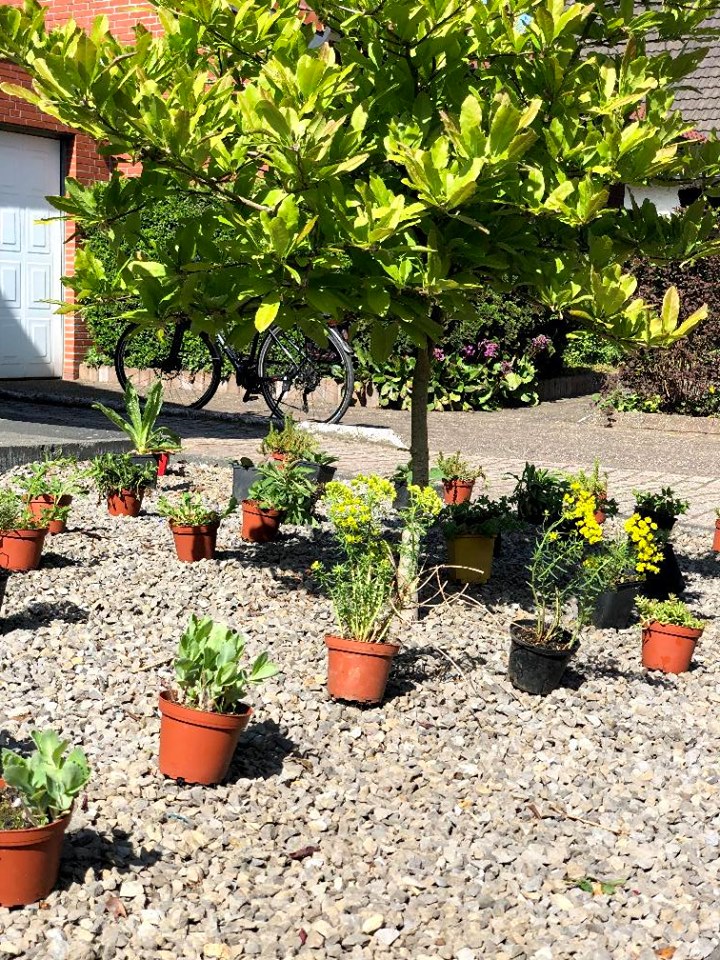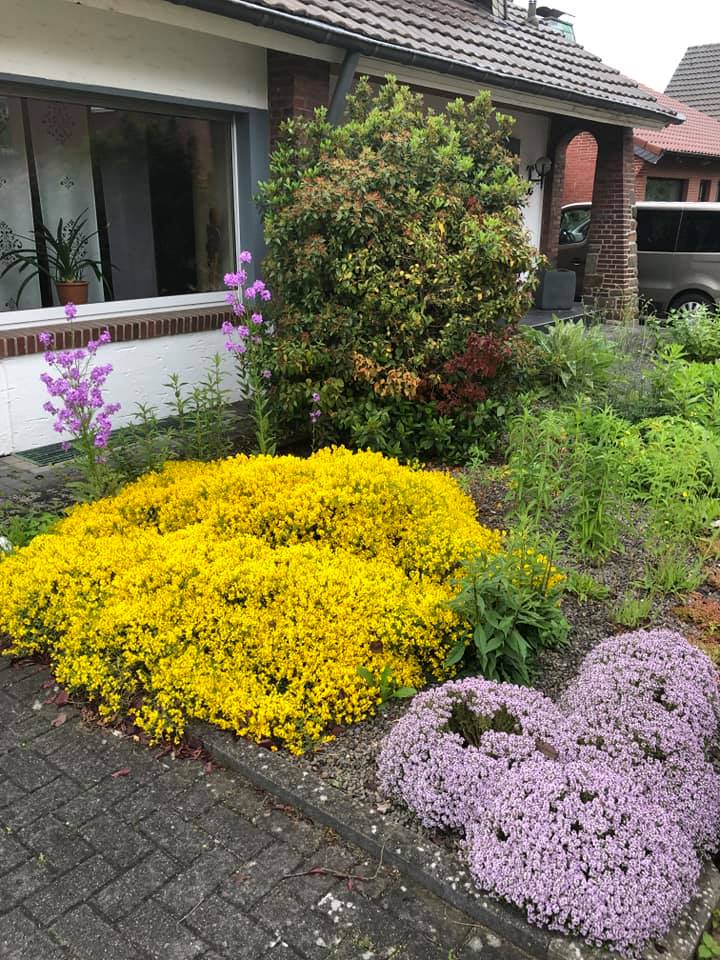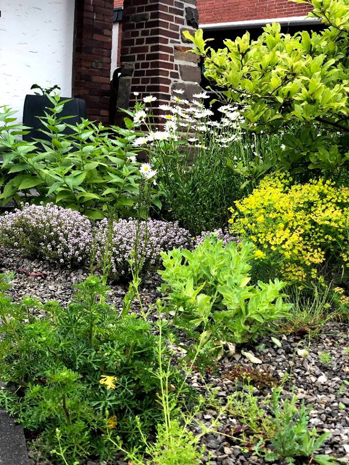 - Mai 2019: Wir haben Wort gehalten, aus der Steinwüste ist eine insektenfreundliche Blühfläche geworden. Arbeitsaufwand und Kosten waren sehr überschaubar und der Mehrwert für unsere Natur ist unbezahlbar.