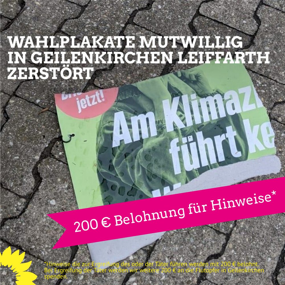 Der Vandalismus und die Zerstörung der Wahlplakate sind kein Kavaliersdelikt und wird von uns nicht geduldet. Wir von B90/DIE GRÜNEN Geilenkirchen haben Strafanzeige gegen Unbekannt gestellt und bitten Sie um Hinweise zu dem Täter oder den Tätern.