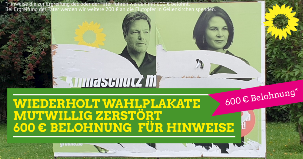 Hinweise die zur Ergreifung des oder der Täter führen werden mit 600 € belohnt. Bei Ergreifung der Täter werden wir weitere 200 € an die Flutopfer in Geilenkirchen spenden.